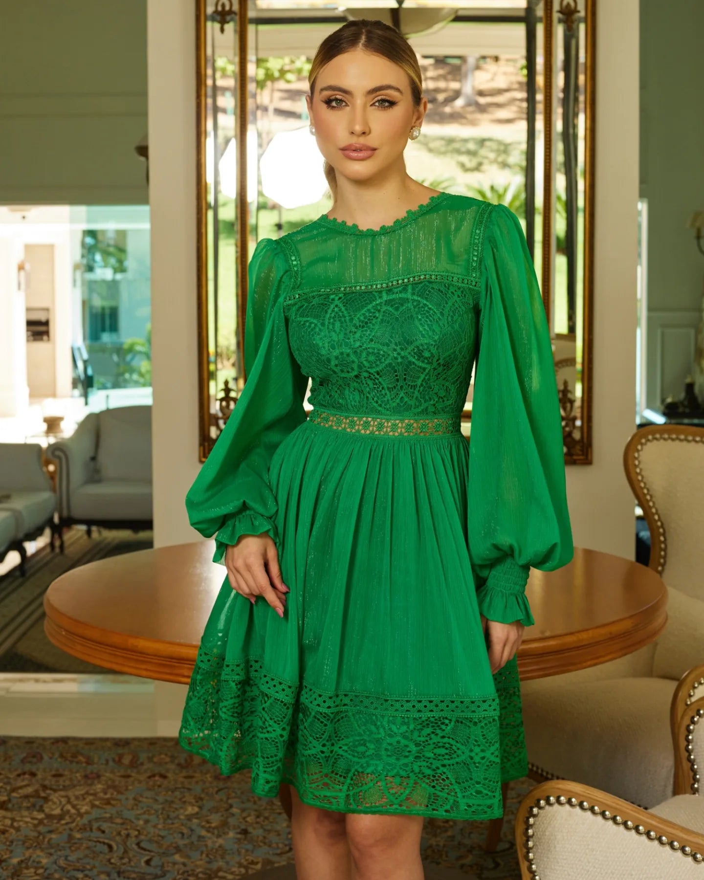 Vestido corto, color verde, fabricado en chifón de seda con encajes, mangas bufantes, escote V en la espalda, incluye copas.
