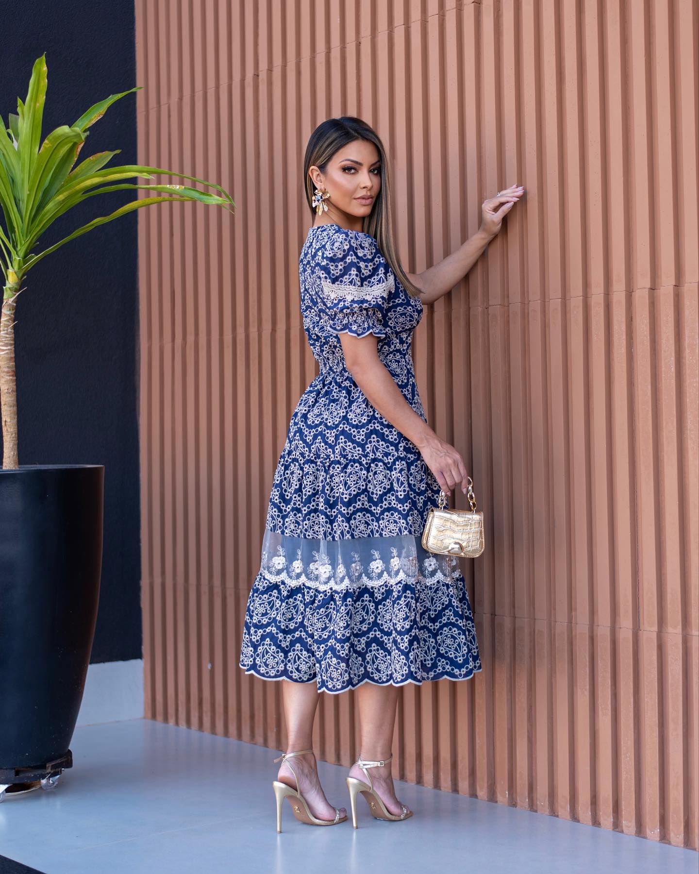 El vestido es un diseño midi con un estampado ornamental en tonos azules y blancos confeccionado en 100% algodón.